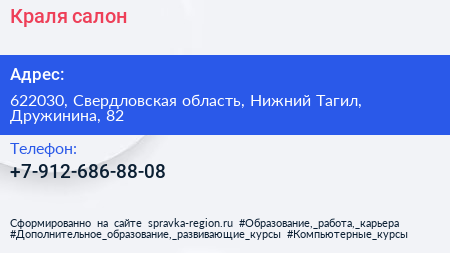 Краля, салон по адресу 622030, Свердловская область, Нижний Тагил, Дружинина, 82 в дальнейшем Организация, размещена в следующих категориях: