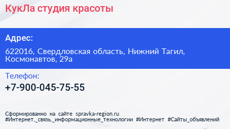 КукЛа, студия красоты по адресу 622016, Свердловская область, Нижний Тагил, Космонавтов, 29а в дальнейшем Организация, размещена в следующих категориях: