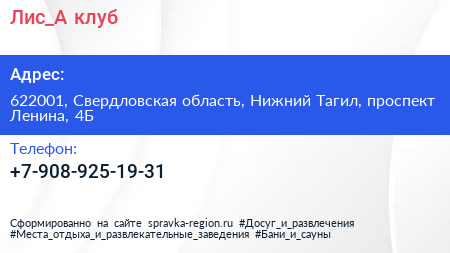 Лис_А, клуб по адресу 622001, Свердловская область, Нижний Тагил, проспект Ленина, 4Б в дальнейшем Организация, размещена в следующих категориях: