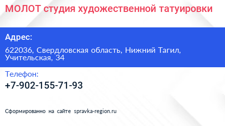 МОЛОТ, студия художественной татуировки по адресу 622036, Свердловская область, Нижний Тагил, Учительская, 34 в дальнейшем Организация, размещена в следующих категориях: