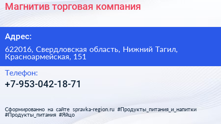 Магнитив, торговая компания по адресу 622016, Свердловская область, Нижний Тагил, Красноармейская, 151 в дальнейшем Организация, размещена в следующих категориях:
