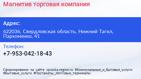 Магнитив, торговая компания по адресу 622036, Свердловская область, Нижний Тагил, Пархоменко, 41 в дальнейшем Организация, размещена в следующих категориях: