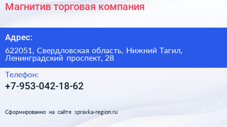 Магнитив, торговая компания по адресу 622051, Свердловская область, Нижний Тагил, Ленинградский проспект, 28 в дальнейшем Организация, размещена в следующих категориях: