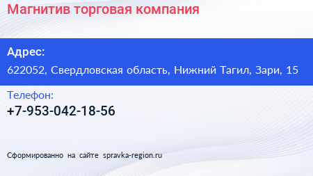 Магнитив, торговая компания по адресу 622052, Свердловская область, Нижний Тагил, Зари, 15 в дальнейшем Организация, размещена в следующих категориях: