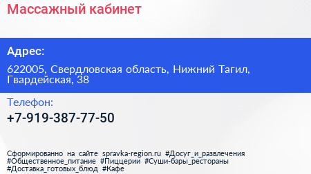 Массажный кабинет по адресу 622005, Свердловская область, Нижний Тагил, Гвардейская, 38 в дальнейшем Организация, размещена в следующих категориях: