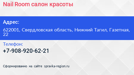 Nail Room, салон красоты по адресу 622001, Свердловская область, Нижний Тагил, Газетная, 22 в дальнейшем Организация, размещена в следующих категориях: