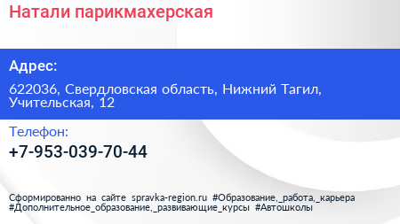 Натали, парикмахерская по адресу 622036, Свердловская область, Нижний Тагил, Учительская, 12 в дальнейшем Организация, размещена в следующих категориях: