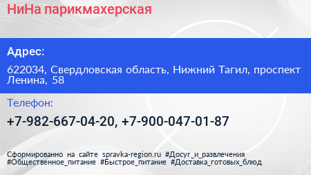 НиНа, парикмахерская по адресу 622034, Свердловская область, Нижний Тагил, проспект Ленина, 58 в дальнейшем Организация, размещена в следующих категориях: