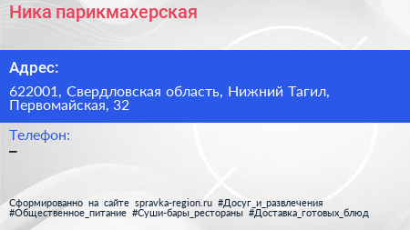 Ника, парикмахерская по адресу 622001, Свердловская область, Нижний Тагил, Первомайская, 32 в дальнейшем Организация, размещена в следующих категориях: