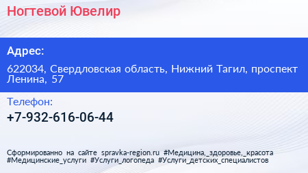 Ногтевой Ювелир по адресу 622034, Свердловская область, Нижний Тагил, проспект Ленина, 57 в дальнейшем Организация, размещена в следующих категориях:
