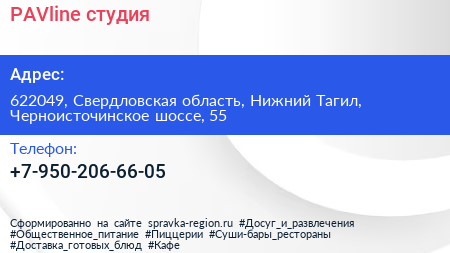 PAVline, студия по адресу 622049, Свердловская область, Нижний Тагил, Черноисточинское шоссе, 55 в дальнейшем Организация, размещена в следующих категориях: