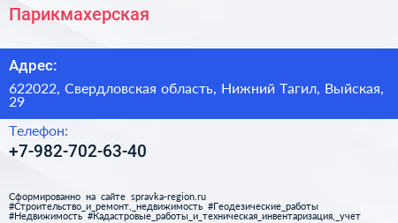 Парикмахерская по адресу 622022, Свердловская область, Нижний Тагил, Выйская, 29 в дальнейшем Организация, размещена в следующих категориях: