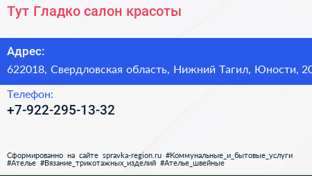 Тут Гладко, салон красоты по адресу 622018, Свердловская область, Нижний Тагил, Юности, 20 в дальнейшем Организация, размещена в следующих категориях: