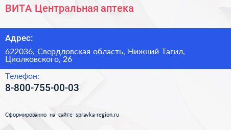 ВИТА Центральная, аптека по адресу 622036, Свердловская область, Нижний Тагил, Циолковского, 26 в дальнейшем Организация, размещена в следующих категориях:
