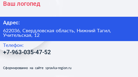Ваш логопед по адресу 622036, Свердловская область, Нижний Тагил, Учительская, 12 в дальнейшем Организация, размещена в следующих категориях: