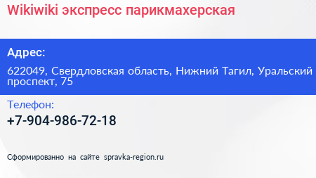 Wikiwiki, экспресс-парикмахерская по адресу 622049, Свердловская область, Нижний Тагил, Уральский проспект, 75 в дальнейшем Организация, размещена в следующих категориях: