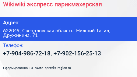 Wikiwiki, экспресс-парикмахерская по адресу 622049, Свердловская область, Нижний Тагил, Дружинина, 71 в дальнейшем Организация, размещена в следующих категориях: