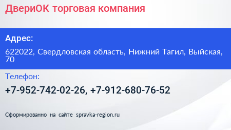 ДвериОК, торговая компания по адресу 622022, Свердловская область, Нижний Тагил, Выйская, 70 в дальнейшем Организация, размещена в следующих категориях: