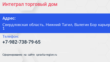 Интеграл, торговый дом по адресу Свердловская область, Нижний Тагил, Валегин Бор карьер, 1 в дальнейшем Организация, размещена в следующих категориях: