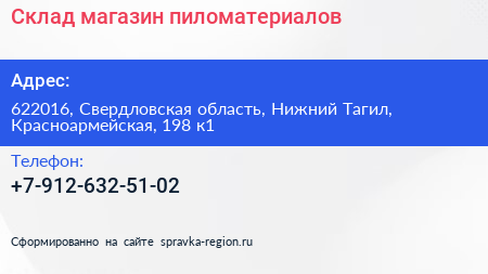 Склад-магазин пиломатериалов по адресу 622016, Свердловская область, Нижний Тагил, Красноармейская, 198 к1 в дальнейшем Организация, размещена в следующих категориях: