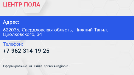 ЦЕНТР ПОЛА по адресу 622036, Свердловская область, Нижний Тагил, Циолковского, 34 в дальнейшем Организация, размещена в следующих категориях: