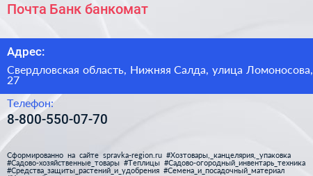 Почта Банк, банкомат по адресу Свердловская область, Нижняя Салда, улица Ломоносова, 27 в дальнейшем Организация, размещена в следующих категориях: