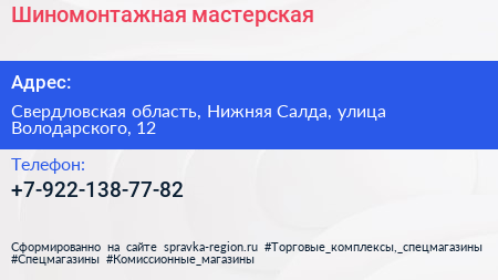 Шиномонтажная мастерская по адресу Свердловская область, Нижняя Салда, улица Володарского, 12 в дальнейшем Организация, размещена в следующих категориях: