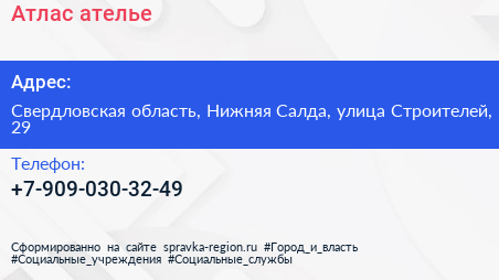 Атлас, ателье по адресу Свердловская область, Нижняя Салда, улица Строителей, 29 в дальнейшем Организация, размещена в следующих категориях: