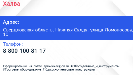 Халва по адресу Свердловская область, Нижняя Салда, улица Ломоносова, 10 в дальнейшем Организация, размещена в следующих категориях: