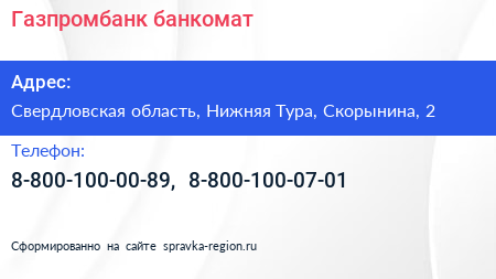 Газпромбанк, банкомат по адресу Свердловская область, Нижняя Тура, Скорынина, 2 в дальнейшем Организация, размещена в следующих категориях: