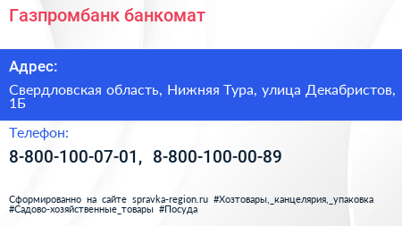Газпромбанк, банкомат по адресу Свердловская область, Нижняя Тура, улица Декабристов, 1Б в дальнейшем Организация, размещена в следующих категориях: