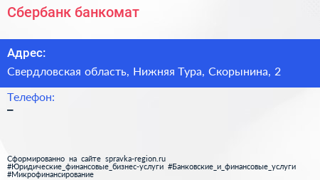 Сбербанк, банкомат по адресу Свердловская область, Нижняя Тура, Скорынина, 2 в дальнейшем Организация, размещена в следующих категориях:
