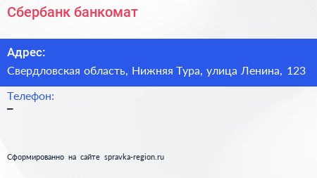 Сбербанк, банкомат по адресу Свердловская область, Нижняя Тура, улица Ленина, 123 в дальнейшем Организация, размещена в следующих категориях: