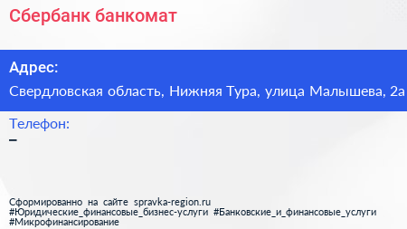 Сбербанк, банкомат по адресу Свердловская область, Нижняя Тура, улица Малышева, 2а в дальнейшем Организация, размещена в следующих категориях: