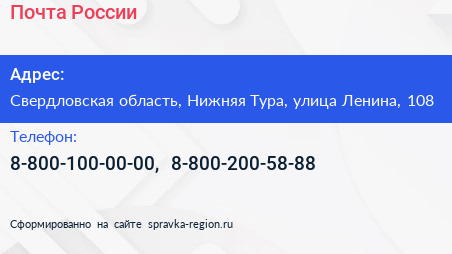 Почта России по адресу Свердловская область, Нижняя Тура, улица Ленина, 108 в дальнейшем Организация, размещена в следующих категориях: