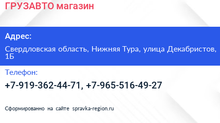 ГРУЗАВТО, магазин по адресу Свердловская область, Нижняя Тура, улица Декабристов, 1Б в дальнейшем Организация, размещена в следующих категориях: