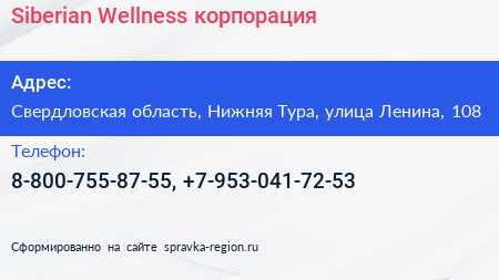 Siberian Wellness, корпорация по адресу Свердловская область, Нижняя Тура, улица Ленина, 108 в дальнейшем Организация, размещена в следующих категориях:
