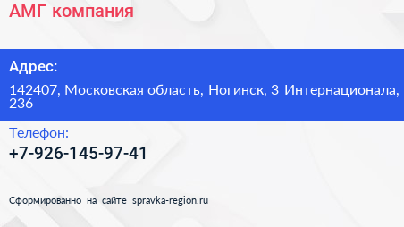АМГ, компания по адресу 142407, Московская область, Ногинск, 3 Интернационала, 236 в дальнейшем Организация, размещена в следующих категориях: