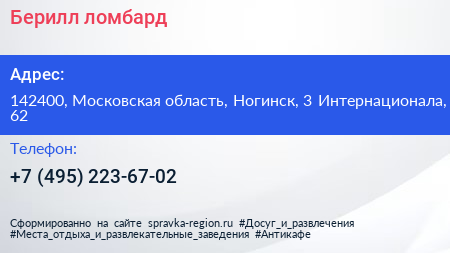 Берилл, ломбард по адресу 142400, Московская область, Ногинск, 3 Интернационала, 62 в дальнейшем Организация, размещена в следующих категориях: