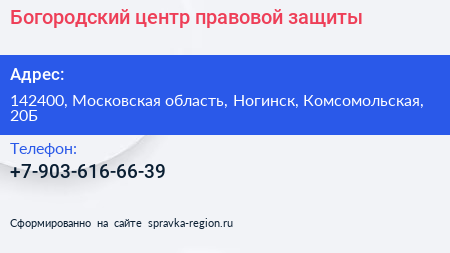 Богородский центр правовой защиты по адресу 142400, Московская область, Ногинск, Комсомольская, 20Б в дальнейшем Организация, размещена в следующих категориях: