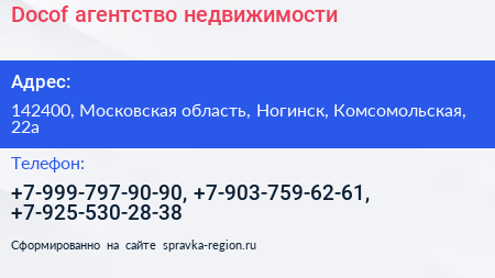 Docof, агентство недвижимости по адресу 142400, Московская область, Ногинск, Комсомольская, 22а в дальнейшем Организация, размещена в следующих категориях: