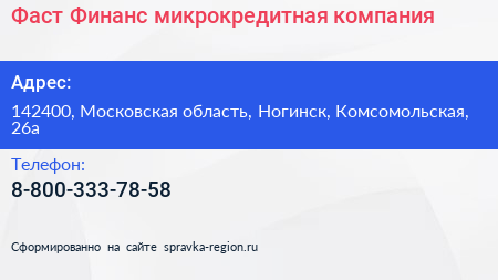 Фаст Финанс, микрокредитная компания по адресу 142400, Московская область, Ногинск, Комсомольская, 26а в дальнейшем Организация, размещена в следующих категориях: