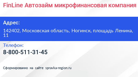 FinLine-Автозайм, микрофинансовая компания по адресу 142402, Московская область, Ногинск, площадь Ленина, 11 в дальнейшем Организация, размещена в следующих категориях: