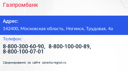 Газпромбанк по адресу 142400, Московская область, Ногинск, Трудовая, 4а в дальнейшем Организация, размещена в следующих категориях: