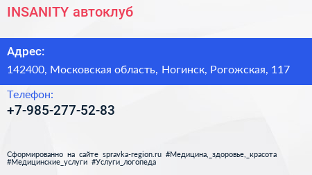 INSANITY, автоклуб по адресу 142400, Московская область, Ногинск, Рогожская, 117 в дальнейшем Организация, размещена в следующих категориях: