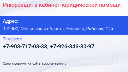 Инюрзащита, кабинет юридической помощи по адресу 142400, Московская область, Ногинск, Рабочая, 12а в дальнейшем Организация, размещена в следующих категориях: