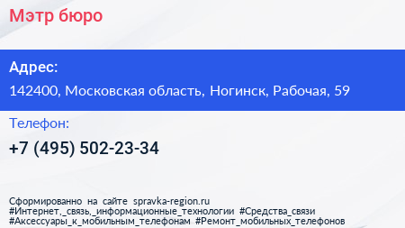 Мэтр, бюро по адресу 142400, Московская область, Ногинск, Рабочая, 59 в дальнейшем Организация, размещена в следующих категориях: