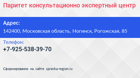 Паритет, консультационно-экспертный центр по адресу 142400, Московская область, Ногинск, Рогожская, 85 в дальнейшем Организация, размещена в следующих категориях: