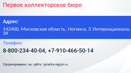Первое коллекторское бюро по адресу 142400, Московская область, Ногинск, 3 Интернационала, 39 в дальнейшем Организация, размещена в следующих категориях: