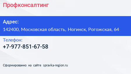 Профконсалтинг по адресу 142400, Московская область, Ногинск, Рогожская, 64 в дальнейшем Организация, размещена в следующих категориях: